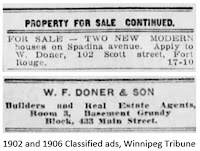 In 1906, W. Doner and Sons "real estate and contractors" had an office on in the Grundy Block on Main Street at Bannatyne, (now demolished), and advertised their services, including lots and finished homes for sale in the classifieds section.